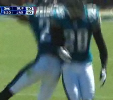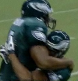 When one player does something exciting (e.g. – a great tackle, a first down, etc.), their celebration often includes some kind of man hug… this could involve a helmet grab, a shoulder or butt pat, or an embrace followed by jumping up and down in unison.