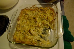Combine with the rest of ingredients in a big bowl and pour mixture into a greased baking dish.