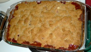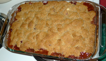 Bake on center rack for 30-35 minutes. The crumb should be golden brown and the berries should be bubbling. Remove from oven and let cool for about 15 minutes. Can be served hot or cold. You may want to add a cream to it (heavy, ice, whipped, etc.) or some yogurt when serving.