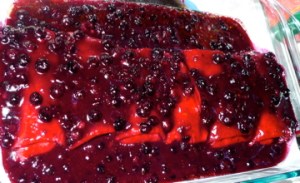Spoon the blueberry sauce on top. I personally think powdered sugar is for pussies, but it’s your blintze, put whatever you want on top.