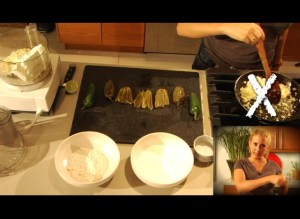 Dip each stuffed pepper in milk, then flour. Then place on a wax lined sheet and freeze for an hour.