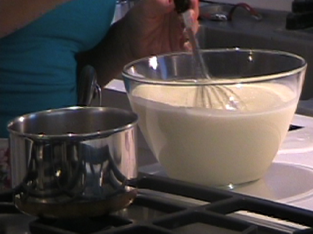 Then slowly stir in the milk, cream, and coconut milk. Wisk well.
