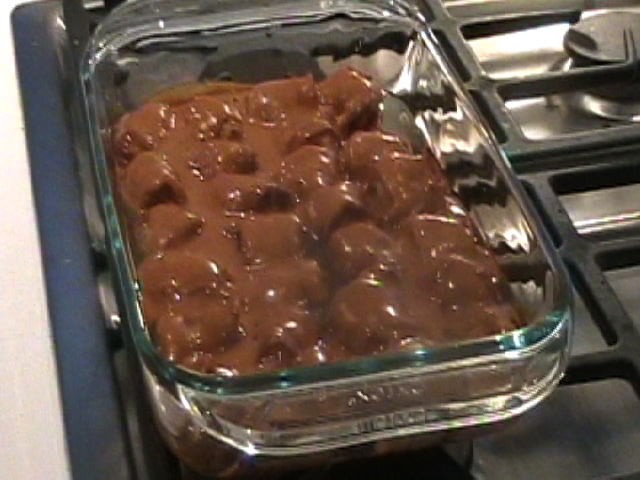 After about 40 min, remove the pan from the oven and pour the sauce from the bowl evenly on top so all of the bacon wrapped water chestnuts are well covered. Return the pan to the oven and cook for another 15-20 min.