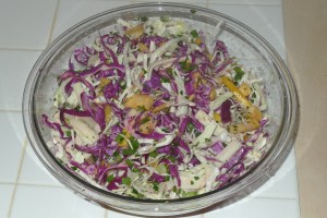 You’re welcome to cut the fruit in any shape you desire, but since there’s shredded cabbage involved and it’s a slaw, I like to keep everything relatively uniform in long strips. Combine all of the ingredients in a bowl and TOSS, TOSS, TOSS! (Ya, that’s “TWO-US” in my mother’s world.)