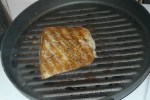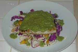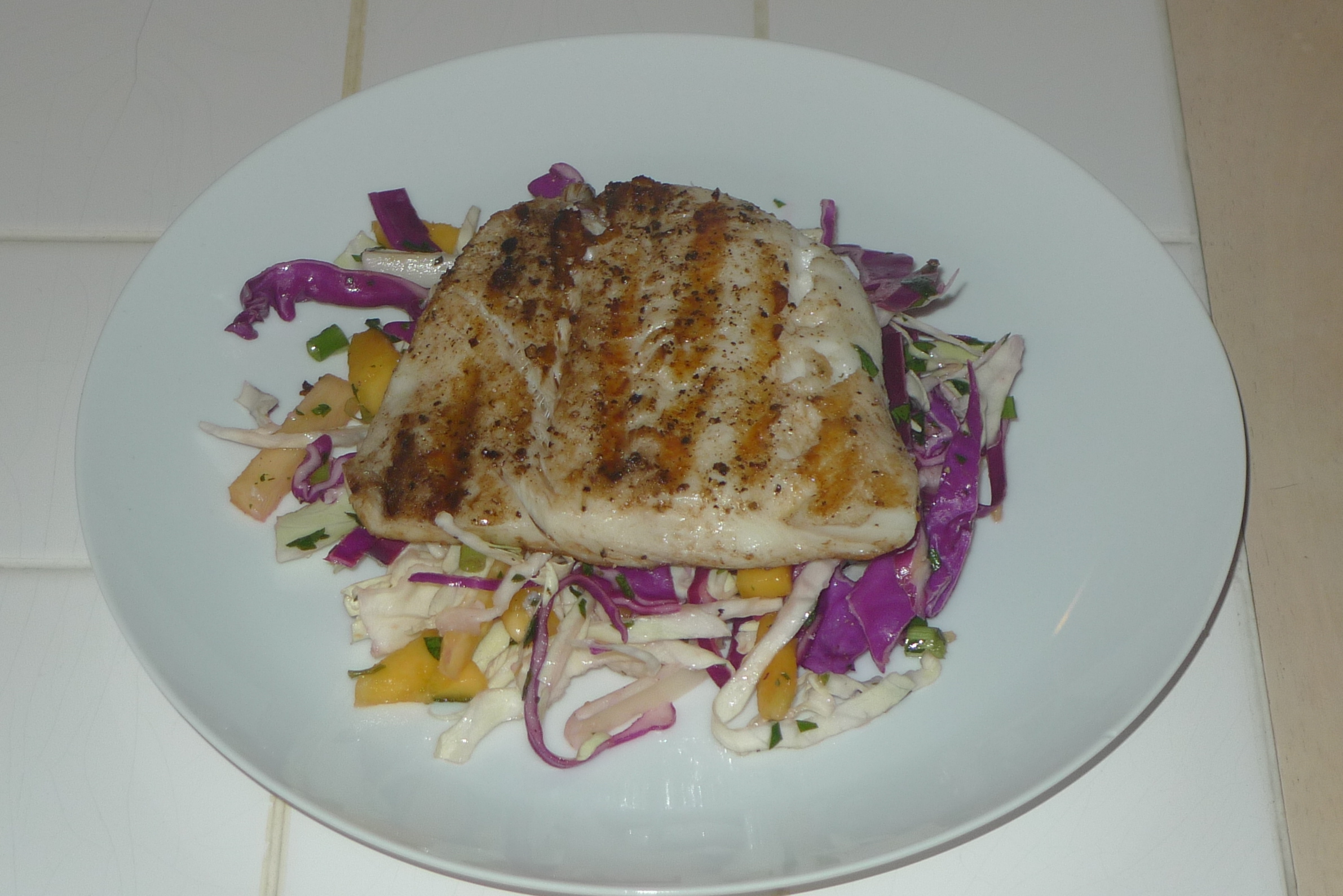 SWOOPS Halibut. (Season With Olive Oil Pepper and Salt) Both sides. Grill on med high heat until charred and just cooked through, about 4 minutes per side. Remove from grill and serve on a bed of the slaw and top with the relish.