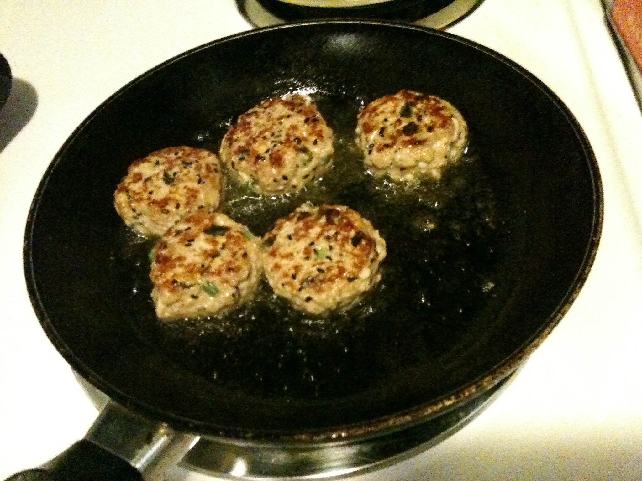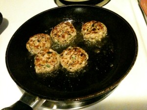 Heat some olive oil in a pan on medium high. Scoop out a small handful of the tuna mixture and form it into a mini burger patty shape. Cook the patties in the oil for a minute on each side. Flip to cook the other side.