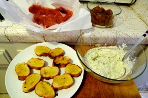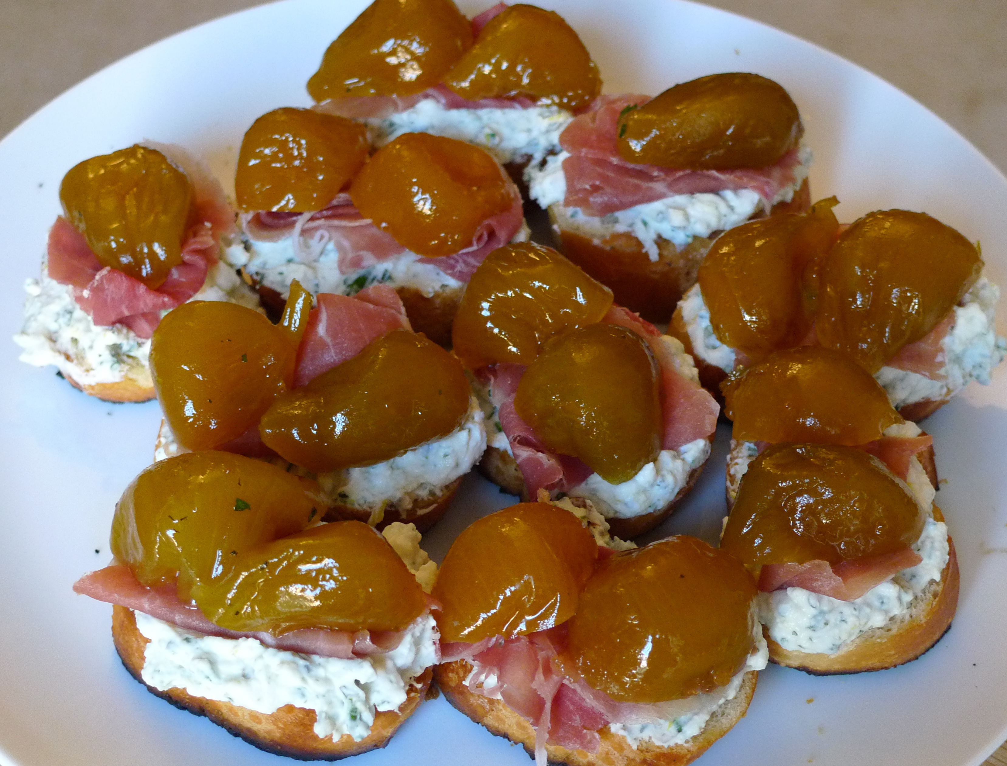 Spread some of the ricotta mixture onto each slice. Then fold a piece of prosciutto on top. Slice the figs in half lengthwise and place some of them on next. Finish off with a light SWOOPS.*