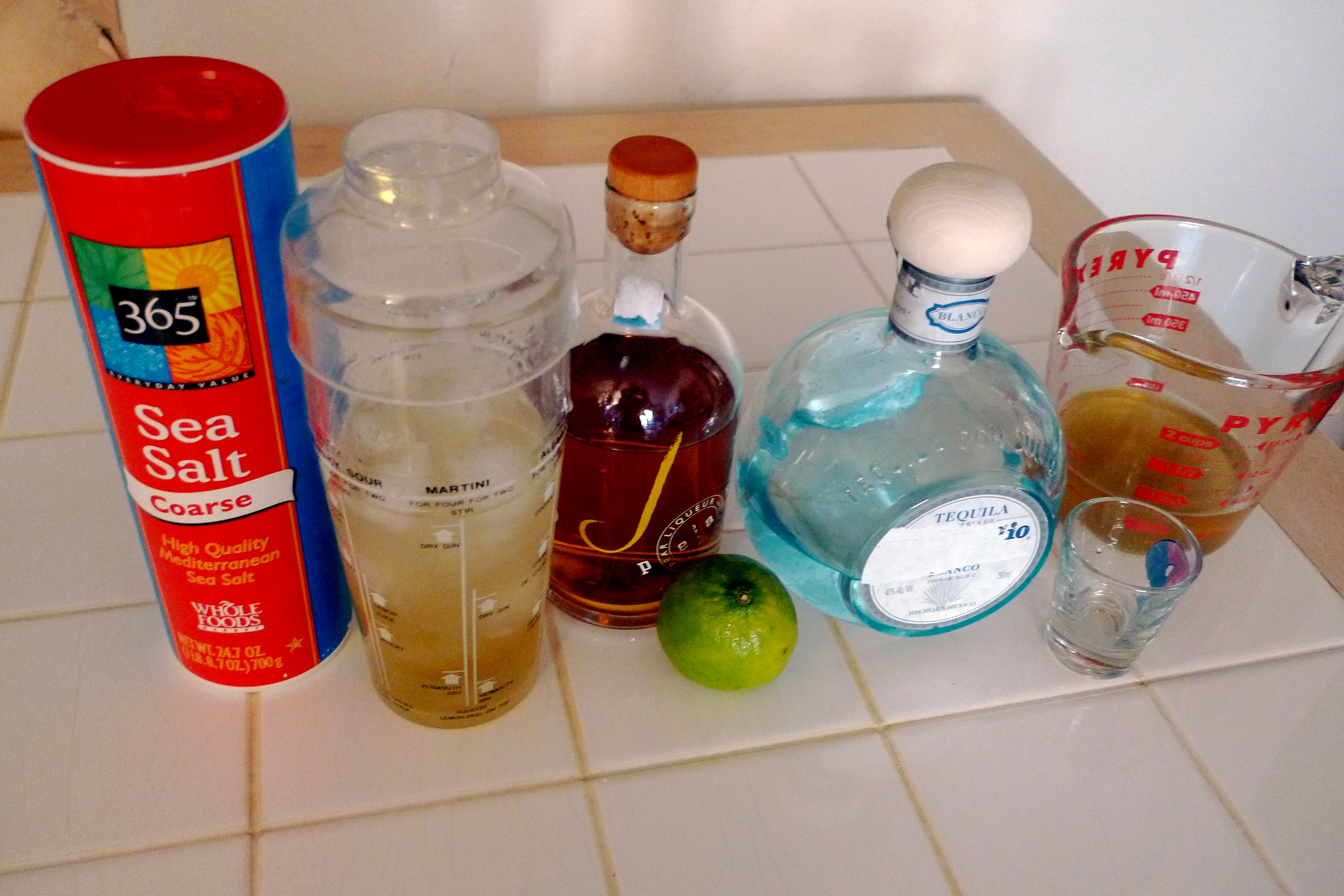Throw all contents into a shaker with some ice. Shake it up. Pour into a glass and down.