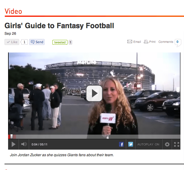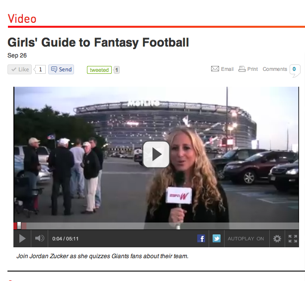Football Girls Guide: Giants – on espnW September 26, 2011 jordzuck Jordan’s first video is up on espnW! Click Here to check it out! Share this: Click to share on Facebook (Opens in new window) Facebook Click to share on X (Opens in new window) X Click to email a link to a friend (Opens in new window) Email Like Loading... Related Share this: Click to share on Facebook (Opens in new window) Facebook Click to share on X (Opens in new window) X Click to email a link to a friend (Opens in new window) Email Like Loading...